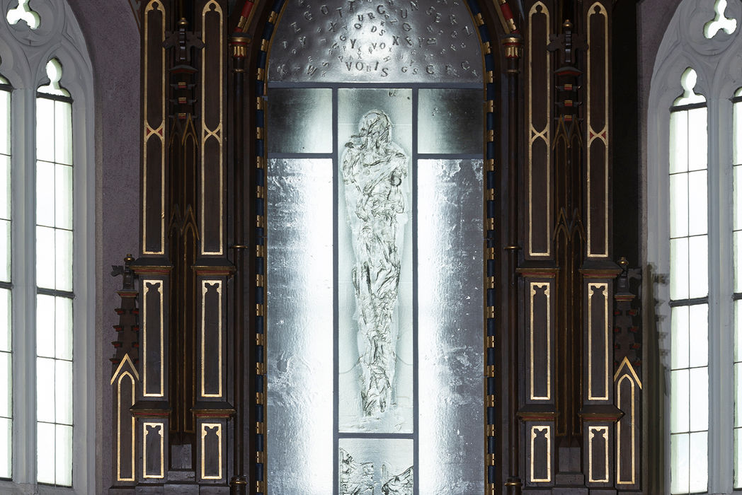 Der historische neugotische Altaraufbau der 1863 errichteten evangelischen Kirche umfasst in einem Spitzbogenfeld, umschlossen von Strebepfeilern und Maßwerk, eine monumentale Glasarbeit, die dem Altarwerk im Jahr 2010 im Rahmen einer Neugestaltung eingefügt wurde und die Stelle eines Altargemäldes einnimmt. Das Werk nimmt die Spitzbogen-Form und Dimension der umgebenden Kirchenfenster auf und ist ebenso bescheiden-farblos wie diese in weißem Glas gestaltet. Der Glasfläche ist ein Tau-Kreuz eingeschrieben, das sich wiederum in vier Felder gliedert. Das zentrale Segment zeigt eine haptisch-strukturierte Figur, in einem speziellen Schmelzverfahren von Glas auf einem Negativabdruck eines Reliefs auf Schamott-Sand ausgeführt, die nicht so sehr dem Kanon einer Kreuzigung als vielmehr der üblichen Bildsprache Valentin Omans entspricht: schlank und statuarisch, ikonengleich. Erhaben scheint sie im Raum über den Gläubigen gegen den Himmel zu schweben, wie in Tücher gehüllt, der Welt entzogen, symbolhaft, gleich einem Zeichen. Nicht konkret und nicht fassbar, transzendent und ephemer, vergeistigt. Die Materialität der Arbeit unterstützt den Eindruck. Das transluzide, nicht-farbige Glas vermittelt die Erscheinung als vergeistigtes Wesen – nicht von dieser Welt. Im Tympanon des Bogenfeldes, das wie ein Schirm über allem aufgespannt scheint, sind formlos Buchstaben ins Glas geschrieben, die mitunter Wortzusammenhänge bilden, die an Gebete, Kirchenlieder und Bibeltexte erinnern und ein religiöses „Rauschen“ simulieren – eine Sphäre der Heiligkeit erzeugen.